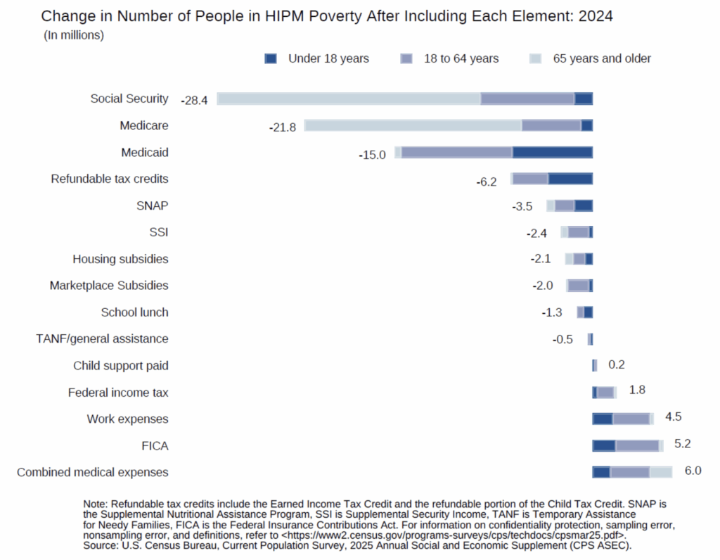 The US Census Bureau publishes two main poverty measures, the official (OPM) and supplemental (SPM). Neither incorporates the value of health insurance into the measures’ thresholds and resources. However, the Census Bureau published a working paper in September 2025 that presents their Health Inclusive Poverty Measures (HIPM), which essentially modifies the existing SPM to incorporate health insurance expenses and resources; resources such as benefits from Medicaid, Medicare, the Children’s Health Insurance Program (CHIP), and marketplace exchange subsidies.