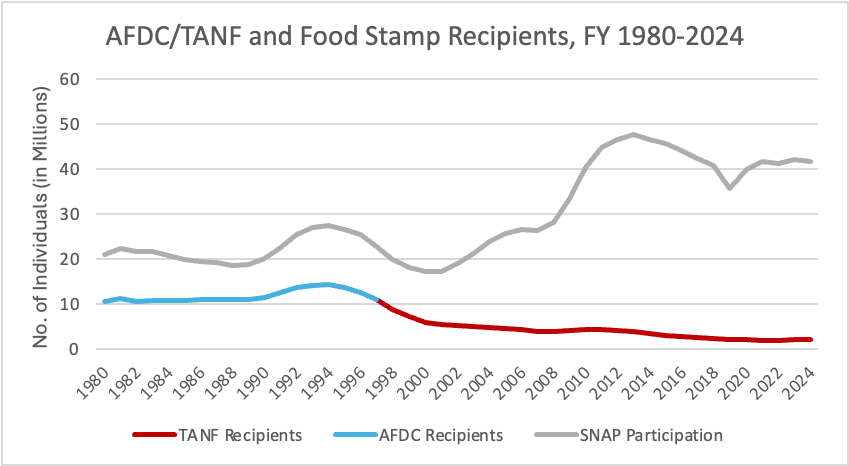 Figure 1. AFDC/TANF and Food Stamp Recipients, Fiscal Years 1980-2024