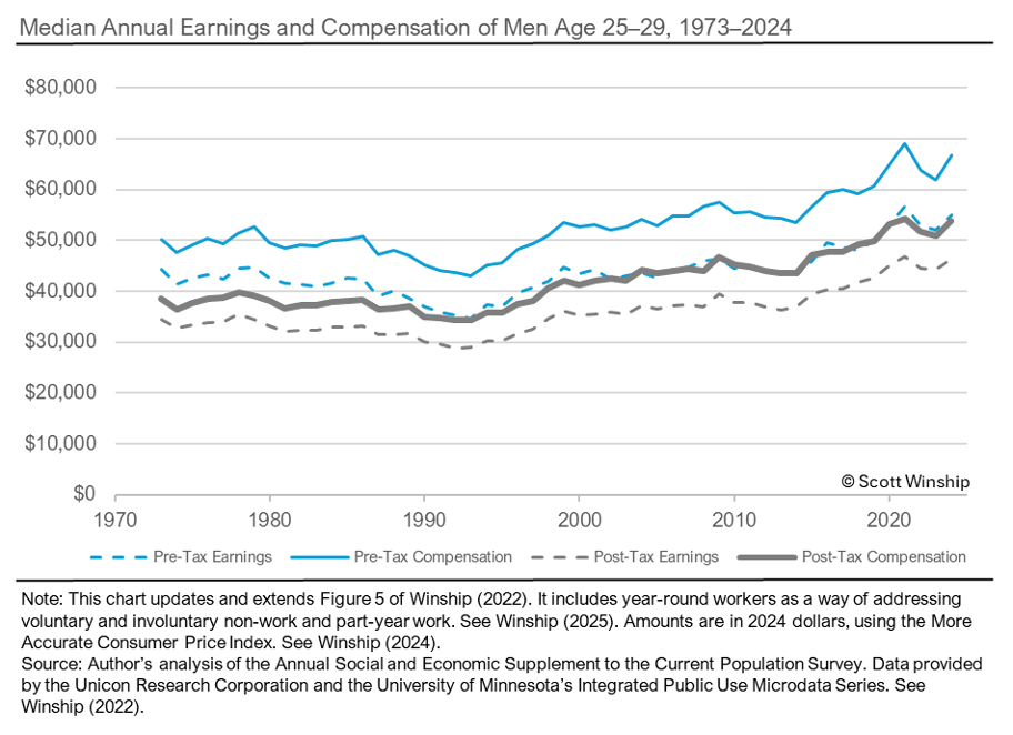 Median pre-tax earnings of men ages 25-29 rose 24 percent ($10,800) from 1973 to 2024, and median post-tax compensation rose 40 percent ($15,500). The gains from 1989 to 2024 were 42 percent ($16,300) and 46 percent ($17,000).